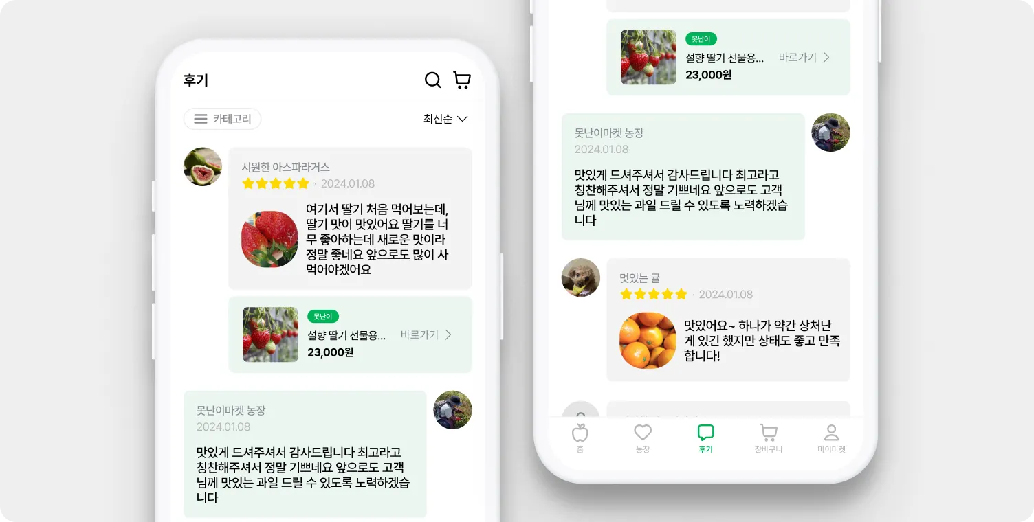 못난이마켓을 이용하는 분들의 다양한 후기들을 실시간으로 모아 볼 수 있도록 실시간 후기 탭을 만들었어요.