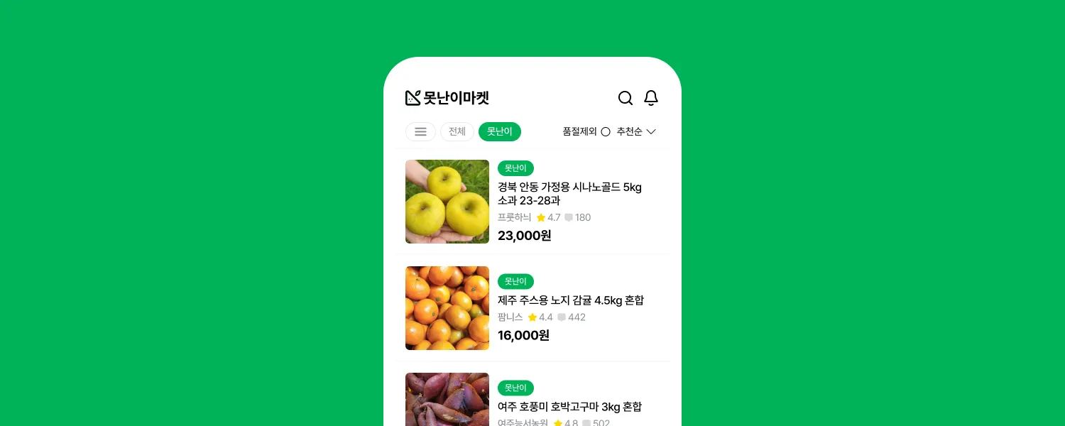 기존 못난이마켓 기능들은 대부분 유지하면서, 불편했던 부분들을 조금씩 개선했어요.