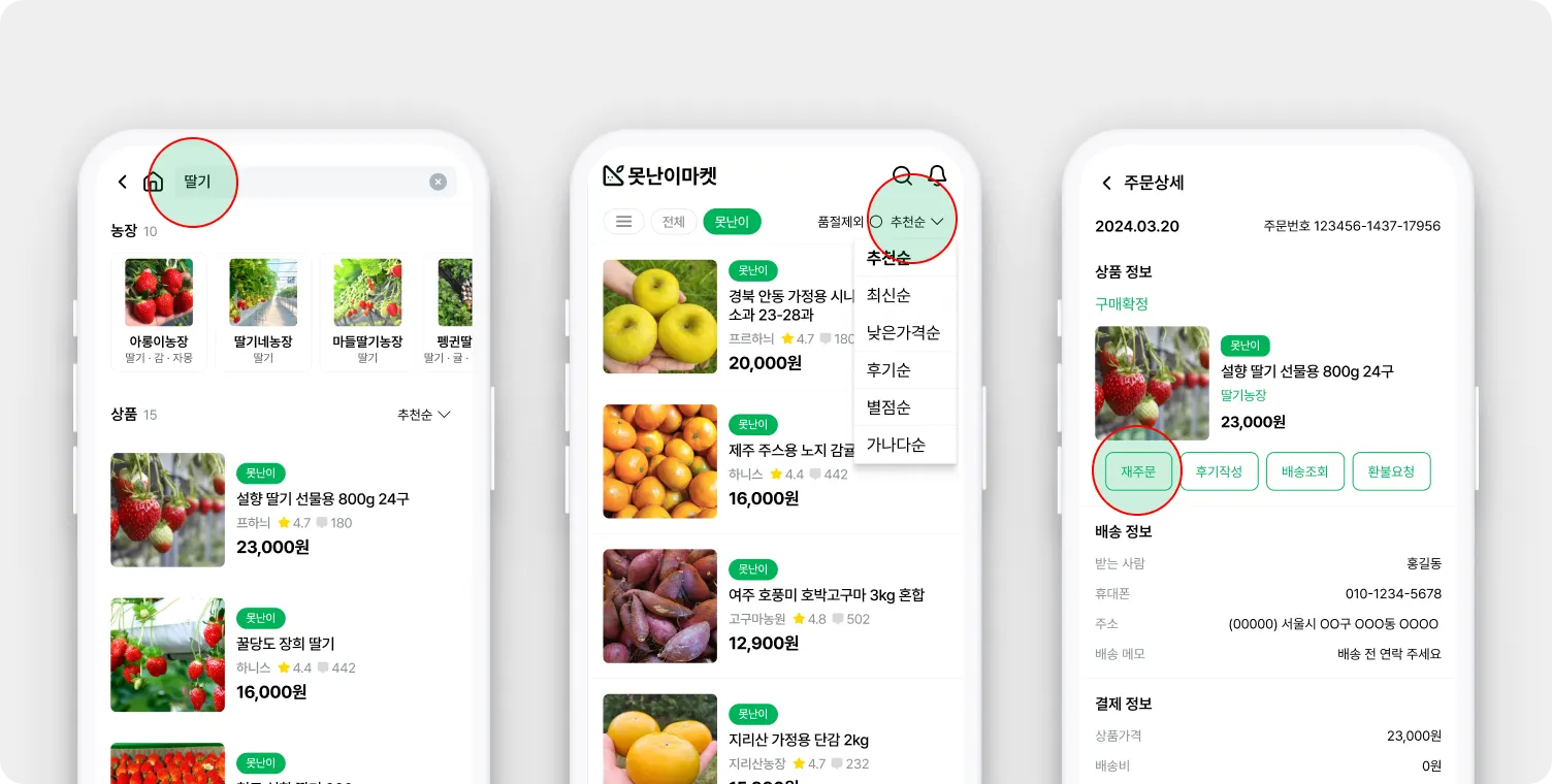 3. 못난이마켓의 편의 기능이 추가되었어요. (검색 기능 / 정렬 기능 / 재주문)